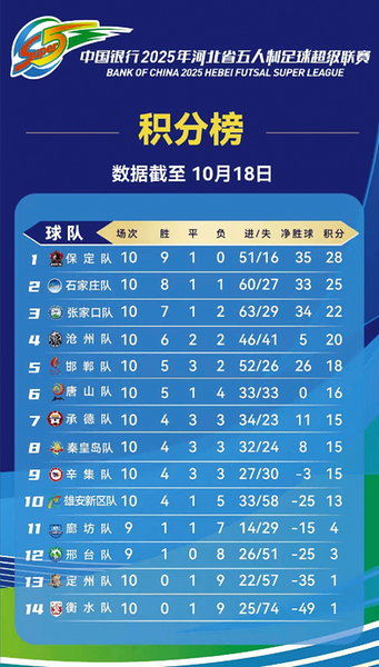张家口队在第十轮后继续稳居积分榜上游,成为冲击前二的有力竞争者。承德队则凭借本场平局收获1分,在中游集团中站稳脚跟,4胜3平3负的战绩使其与周边球队的分差保持在可控范围内。