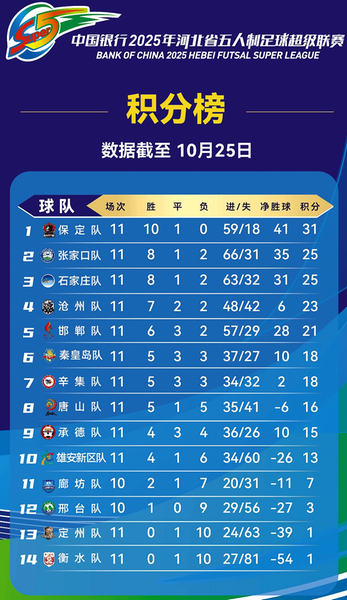 张家口队与石家庄队同积25分,形成激烈的次席之争。张家口队本轮3比2险胜承德队,凭借66粒进球带来的35个净胜球优势,成功反超石家庄队跃居积分榜第二位;石家庄队本轮3比5不敌邯郸队,虽11轮保持8胜1平2负的战绩,但31个净胜球略逊于张家口队,暂列第三位。