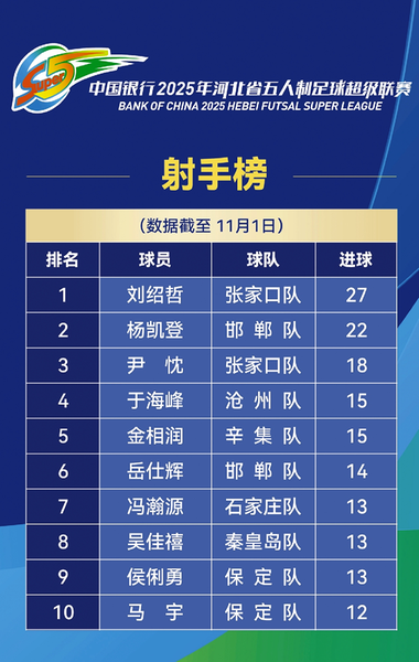 截至11月1日,本轮多场进球大战让射手榜竞争愈发激烈。张家口队的刘绍哲以27粒进球成功登顶射手榜榜首,成为本轮最大亮点;邯郸队的杨凯登以22球位居次席;张家口队的尹忱以18球位列第三;沧州队的于海峰和辛集队的金相润同入15球,分列第四、五位。石家庄队的冯瀚源、保定队的侯俐勇与马宇等射手也都有稳定进球输出,后续射手榜的排名走势值得持续关注。