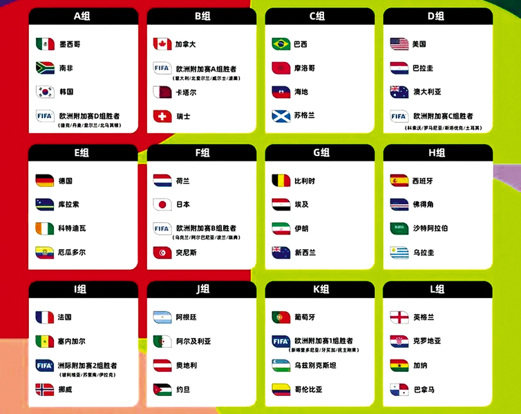 本报讯 北京时间12月6日凌晨,2026年美加墨世界杯分组抽签仪式结束。48强中的42支球队席位落定,剩余6个名额将在明年3月确定,其中欧洲区附加赛决出4个名额,洲际附加赛将决出2个名额。揭幕战将由墨西哥对阵南非。本届世界杯将是世界杯历史上首次扩军至48支球队参赛,在美国、墨西哥和加拿大的16座城市将一共进行104场比赛。根据抽签结果,法国、塞内加尔、挪威造死亡之组;英格兰与克罗地亚将在小组赛相遇,卫冕冠军阿根廷抽到上上签。