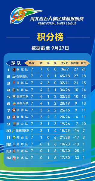 另外,邯郸队凭借9比1轻取定州队的酣畅胜利,以15积分稳居积分榜第三位,球队在单节打入4球的进攻爆发力令人印象深刻;秦皇岛队凭借流畅的边中结合战术多点开花,主场以7比1战胜雄安新区队;承德队主场4比1完胜廊坊队,队长卢咏泽在决胜节率先破门,带领球队打破僵局,展现了传控战术的成效。