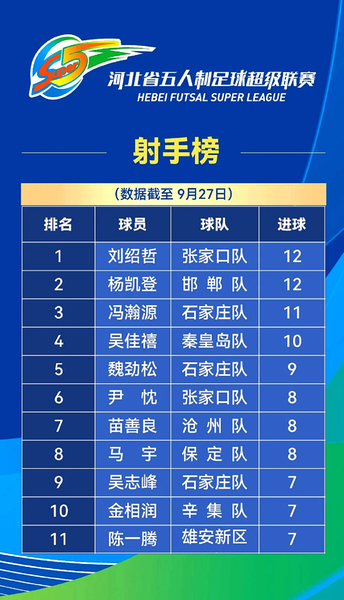 第七轮赛事让射手榜竞争也更趋激烈,张家口队球员刘绍哲“解禁”复出即上演“五子登科”,凭借单场5粒进球的惊艳表现,与邯郸队球员杨凯登同以12粒进球并列射手榜首位。石家庄队球员冯瀚源以11粒进球紧随其后,仅落后榜首1球,后续赛事的冲榜悬念十足。此外,秦皇岛队吴佳禧、石家庄队魏劲松等球员也凭借多球表现跻身射手榜前列。赛场激战,强队领跑与黑马突围