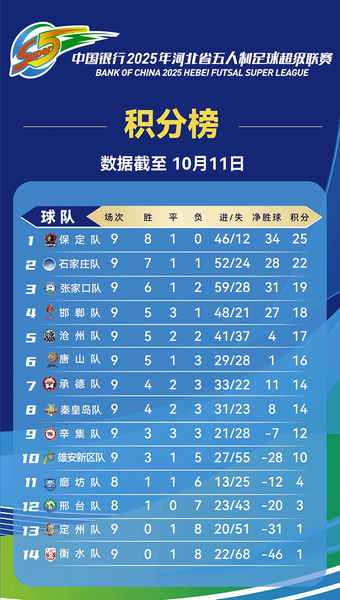 截至10月11日,保定队以9场比赛8胜1平0负的战绩,积25分高居积分榜榜首,且进46球失12球,净胜球达34个,优势十分明显。石家庄队以7胜1平1负积22分的成绩位列次席,进52球失24球,净胜球28个。张家口队6胜1平2负积19分排名第三,进59球失28球,净胜球31个。