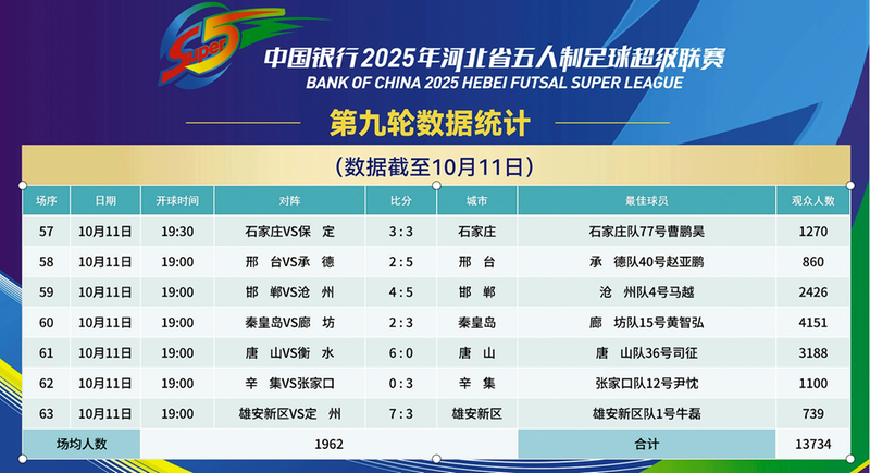 本轮赛事的进攻火力堪称惊艳,多场对决上演攻防快节奏切换。石家庄队与保定队的焦点战中,双方你来我往战成3:3平,将攻防平衡演绎得淋漓尽致;承德队5比2大胜邢台队、雄安新区队7:3力克定州队,均以大比分展现了高效进攻体系;沧州队5:4险胜邯郸队的较量更是跌宕起伏,每一粒进球都牵动着现场观众的心弦。而唐山队6:0横扫衡水队、张家口队3:0轻取辛集队的比赛中,强队的防守端同样展现出压制力,形成攻防双线亮点。观众热情与赛事精彩度形成完美呼应,观众总人数合计13734名,场均达到1962人,体现出“河北五超”的超高人气,以及群众的喜爱程度。